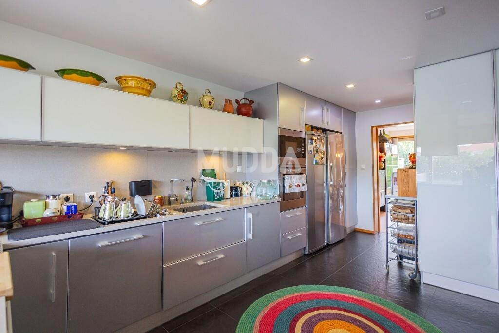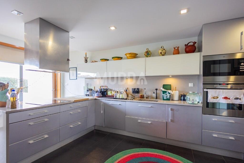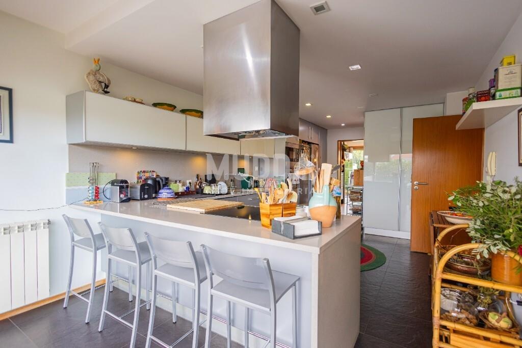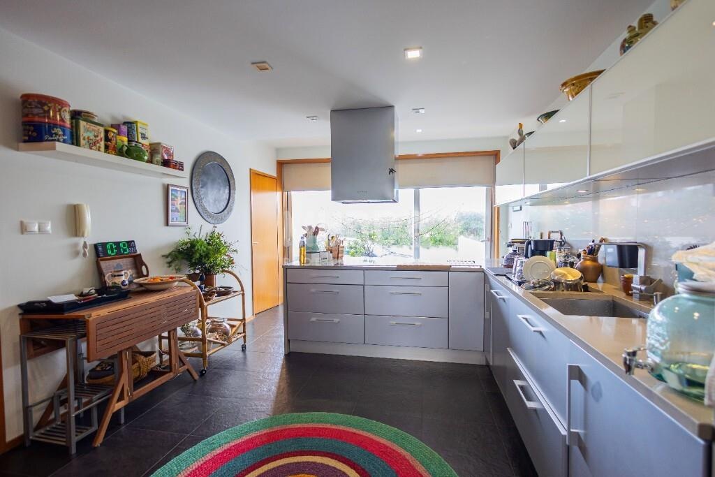 A cozinha, orientada para a frente da moradia, destaca-se pela ampla superfície envidraçada, que proporciona uma luminosidade excecional. Encontra-se totalmente equipada e dispõe de uma moderna ilha com capacidade para 6 pessoas — perfeita para momentos de convívio. Conta ainda com lavandaria independente.