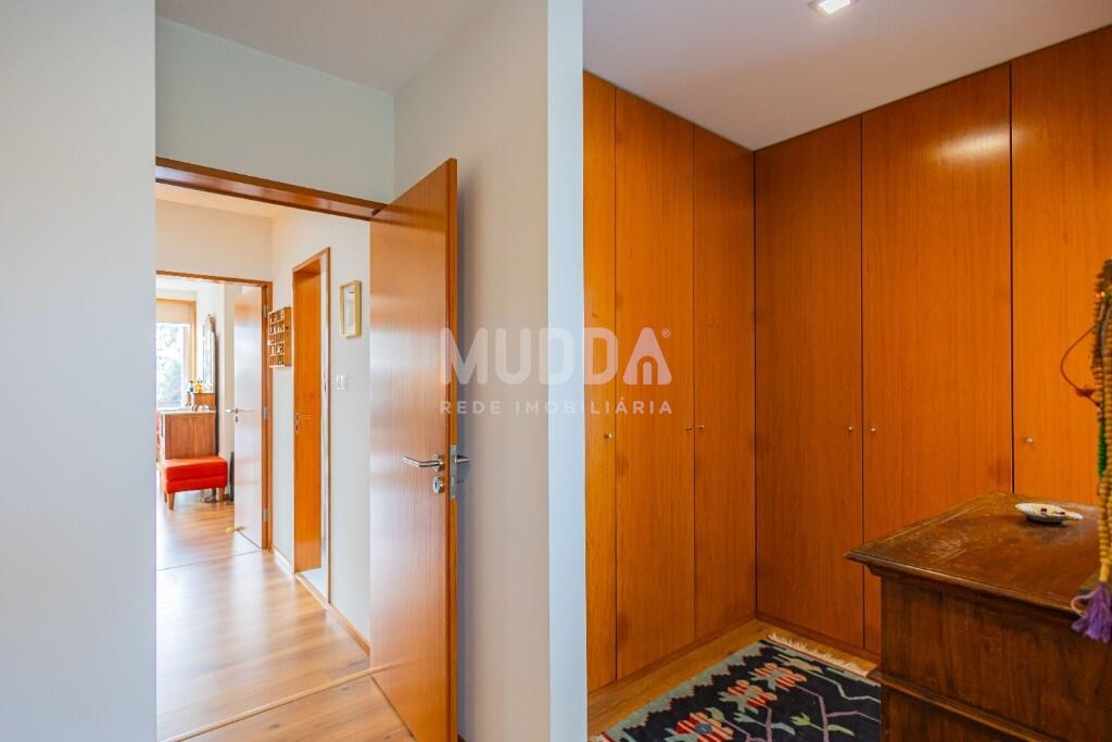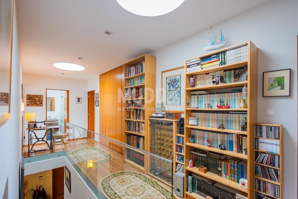 O acesso ao primeiro piso é feito através de uma elegante escadaria em madeira, complementada por roupeiro embutido e duas claraboias que inundam a zona de circulação com luz natural.