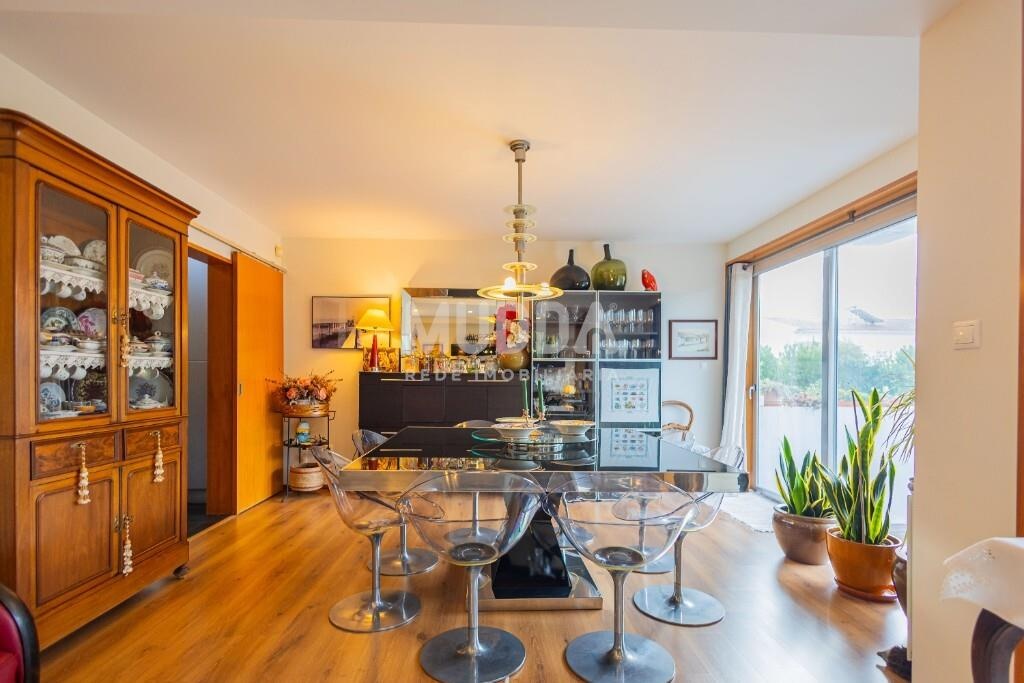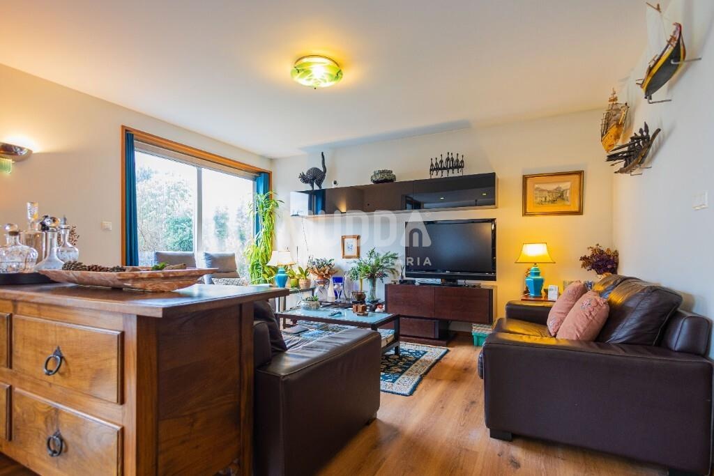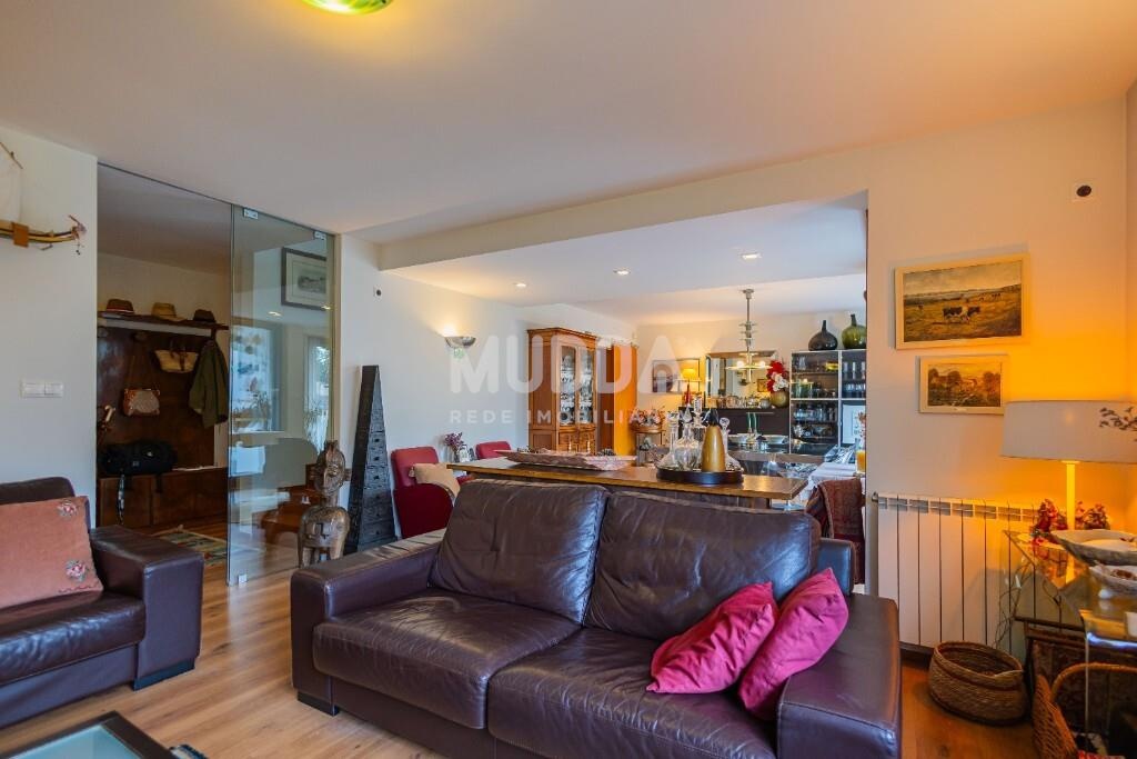 A sala de estar, ampla e luminosa, desenvolve-se em continuidade com o jardim e a zona de churrasqueira nas traseiras, criando uma ligação fluida entre interior e exterior — ideal para desfrutar de momentos de lazer em família ou com amigos.